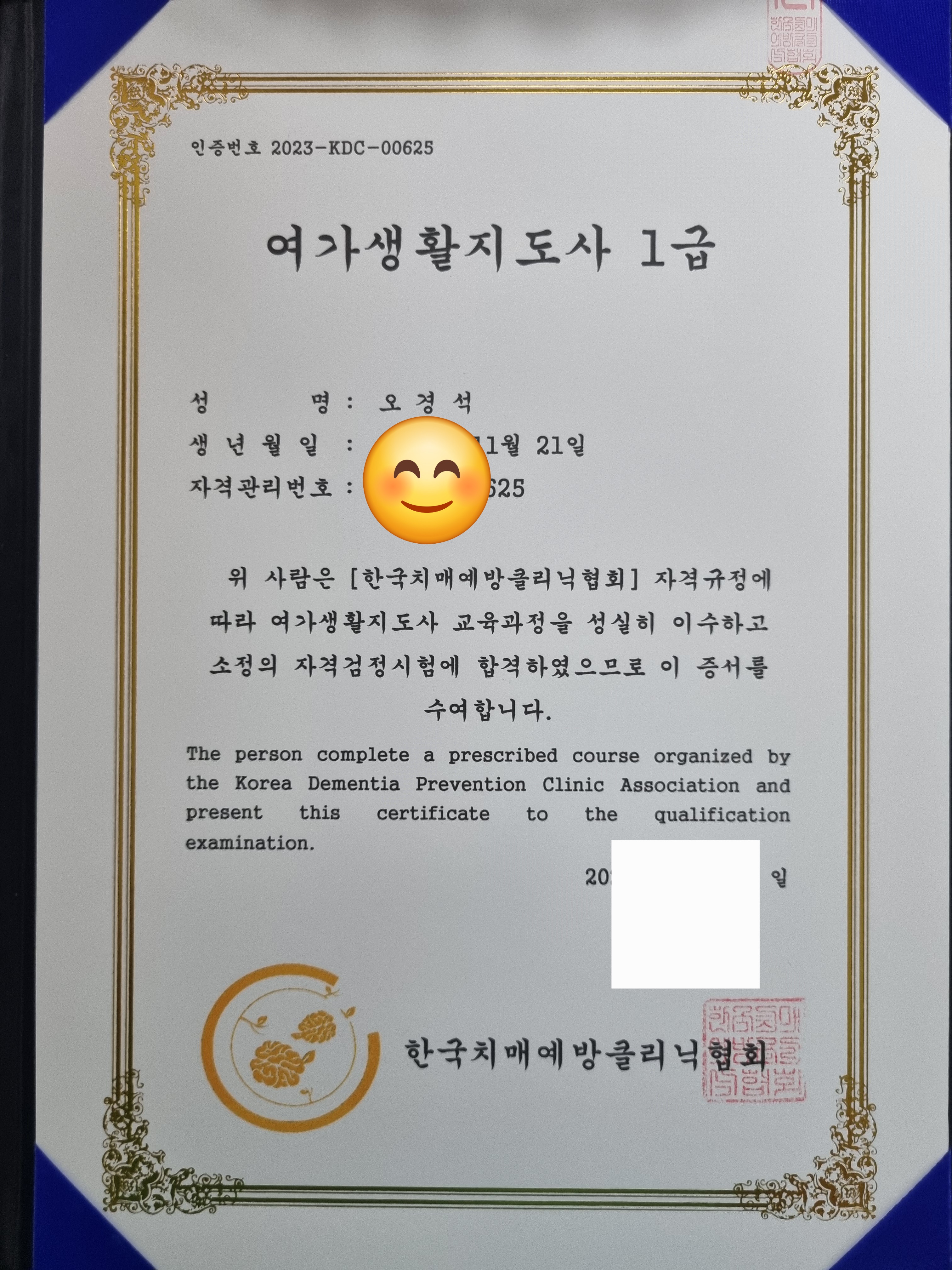 제가 한국치매예방클리닉 협회에서 여가생활지도사 1급 자격증을 취득했습니다.^^