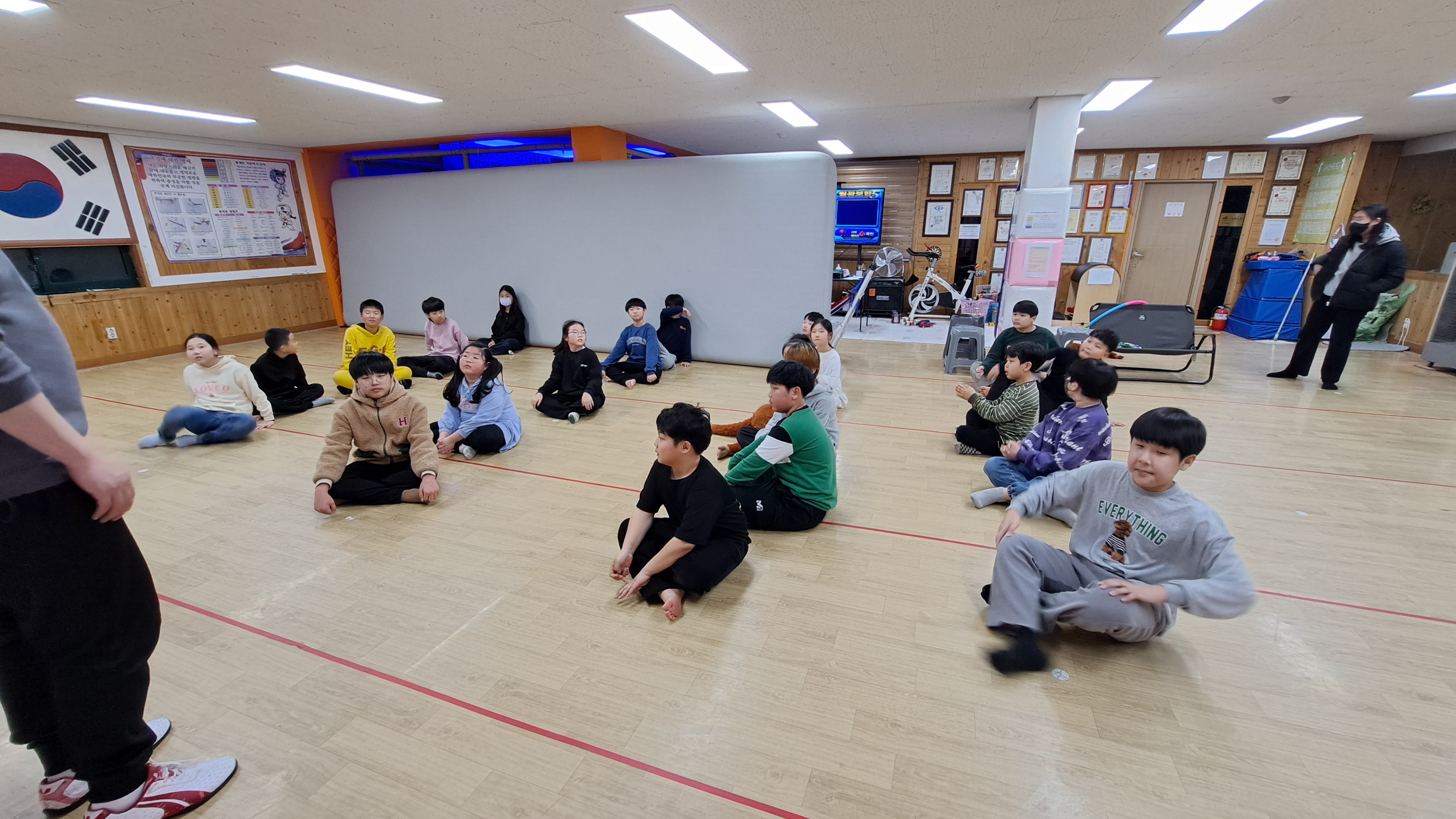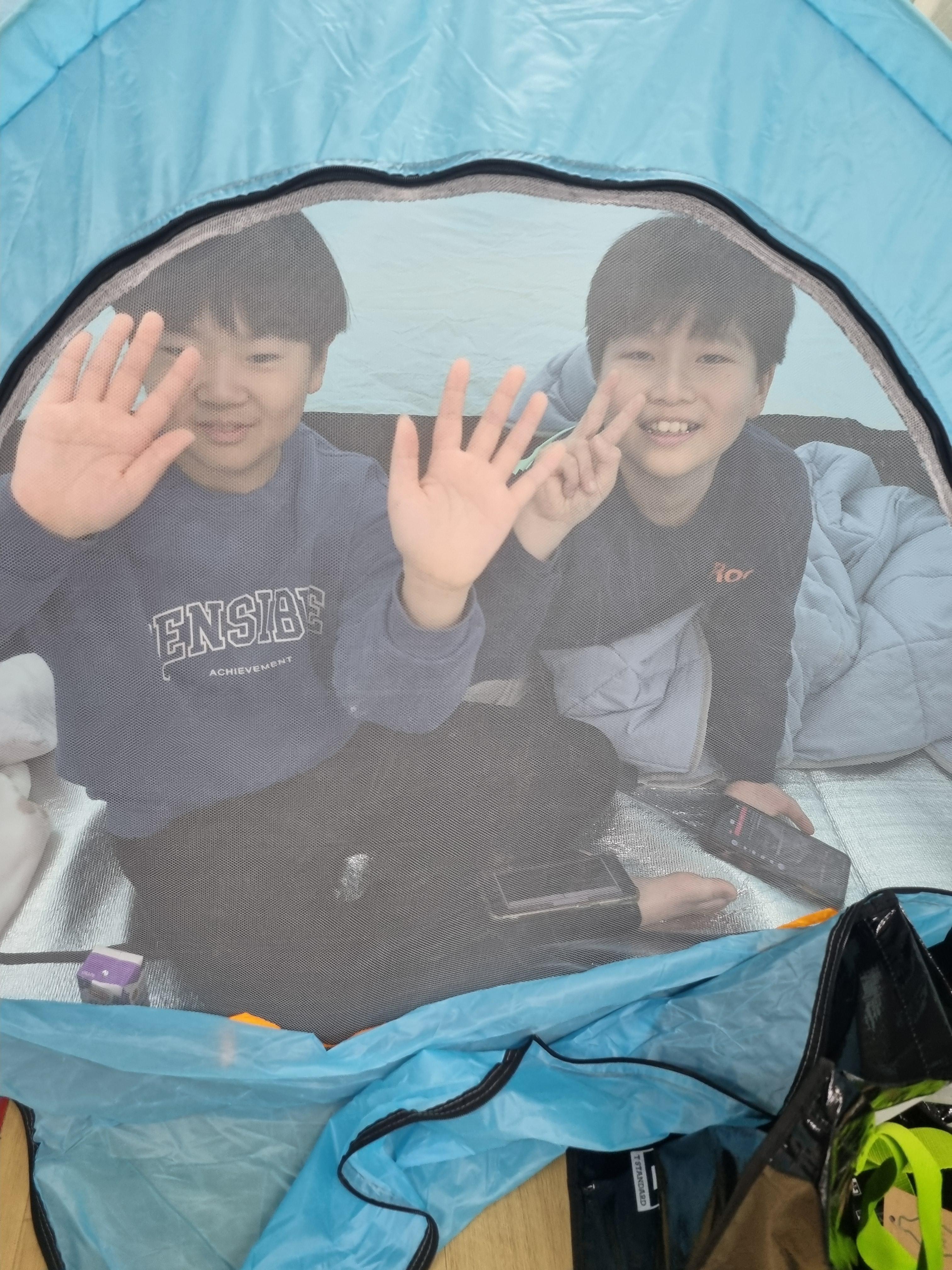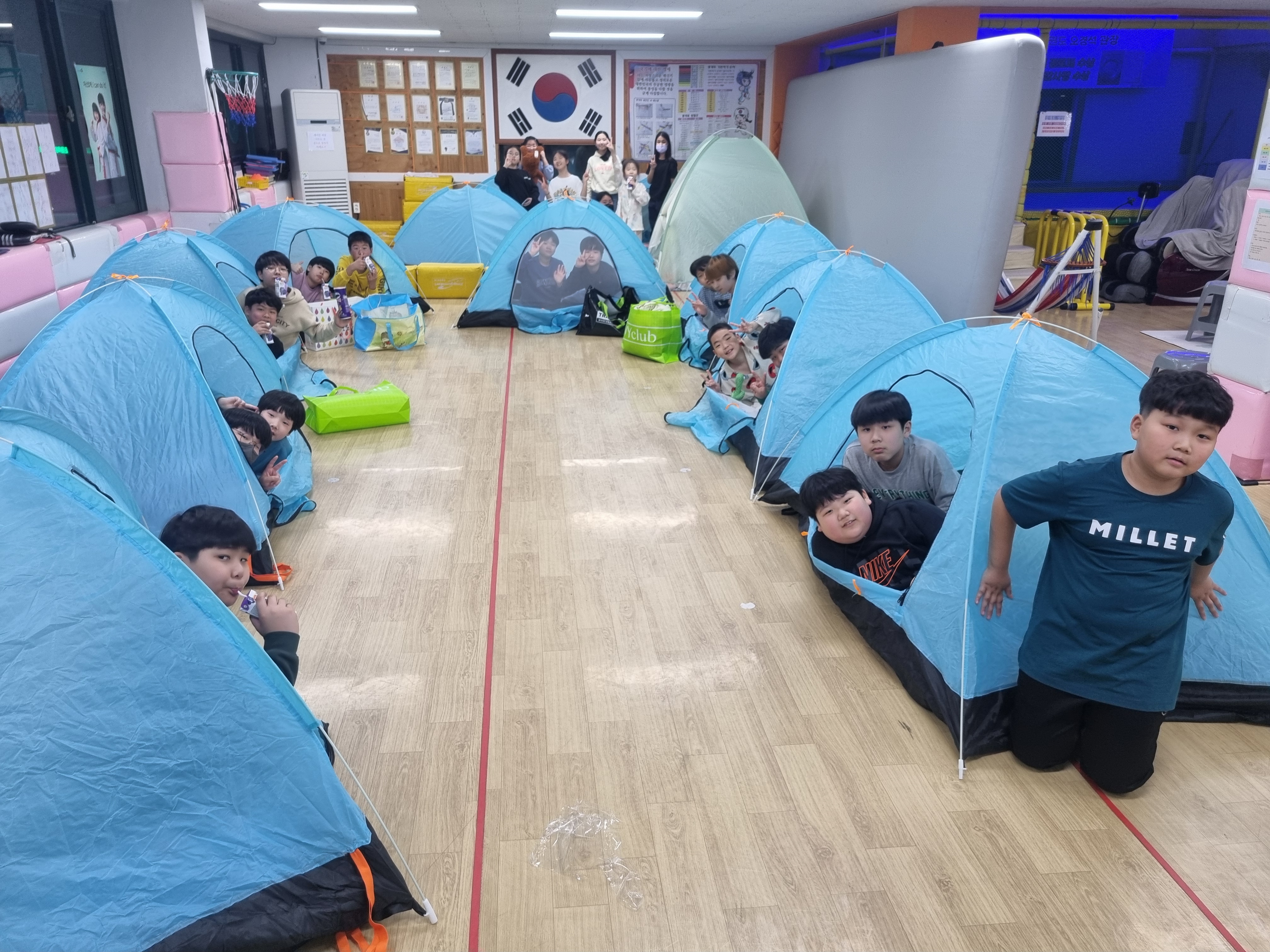 산책후 태권도장에 와서 텐트와 이불정리를 한 후