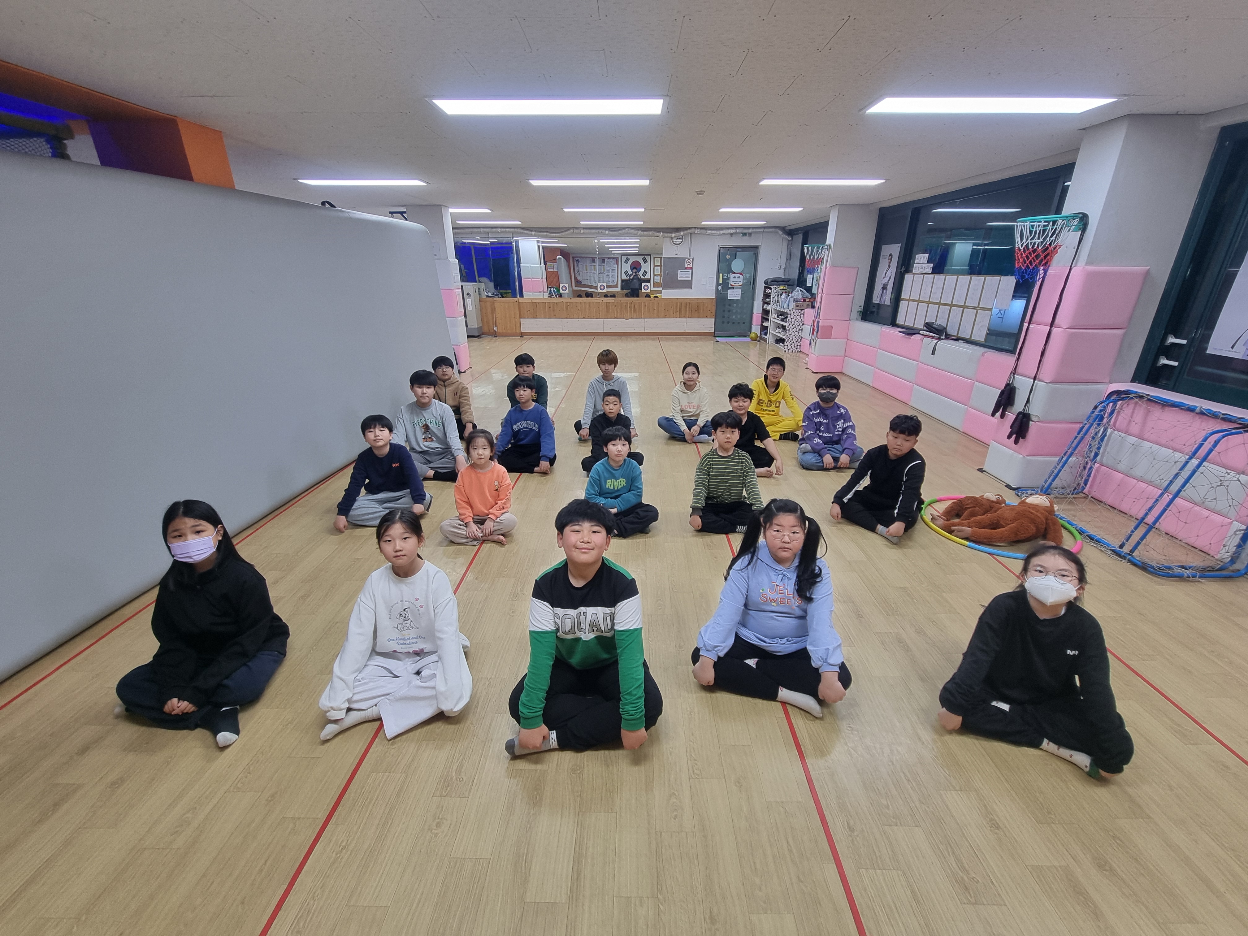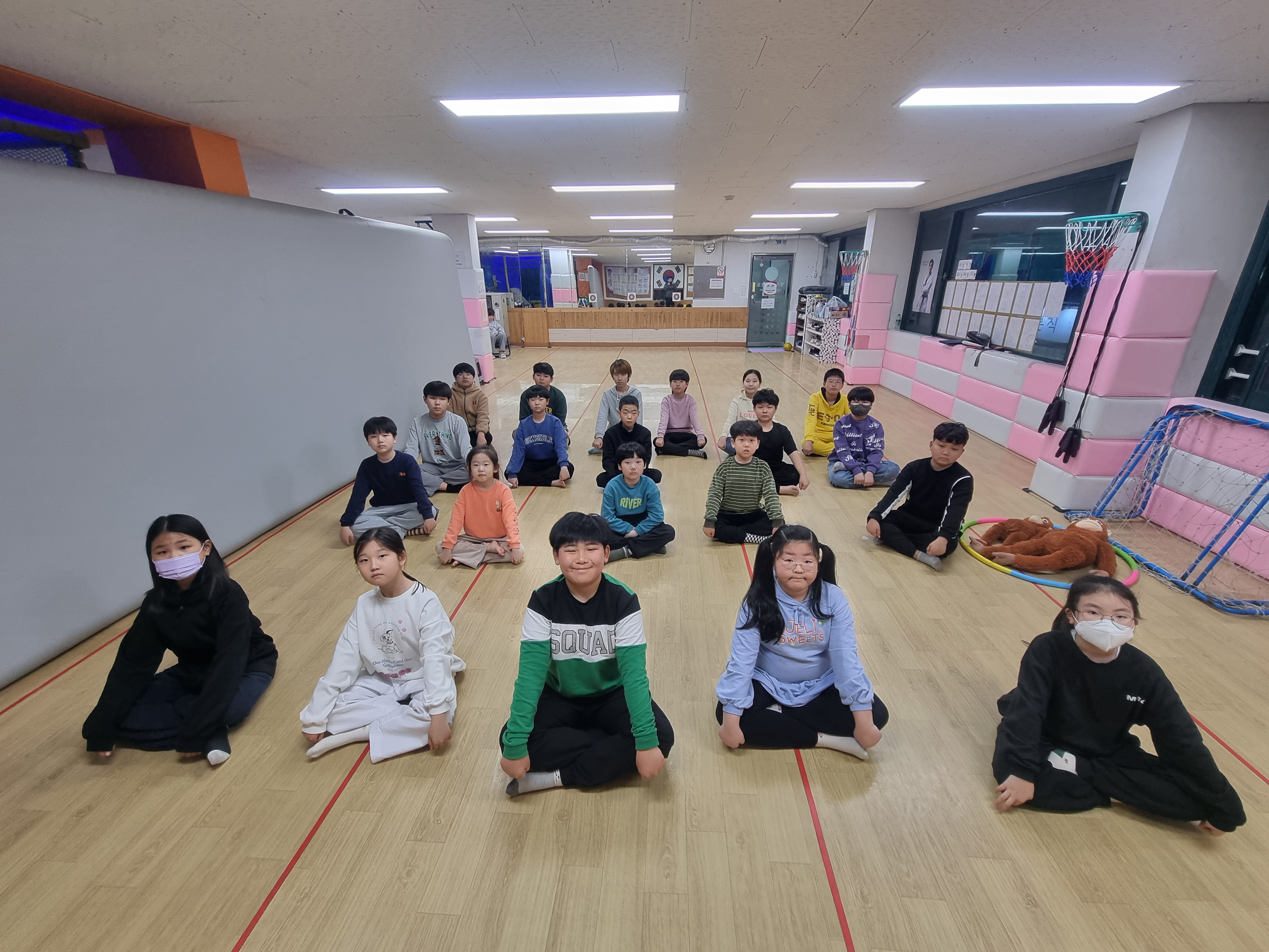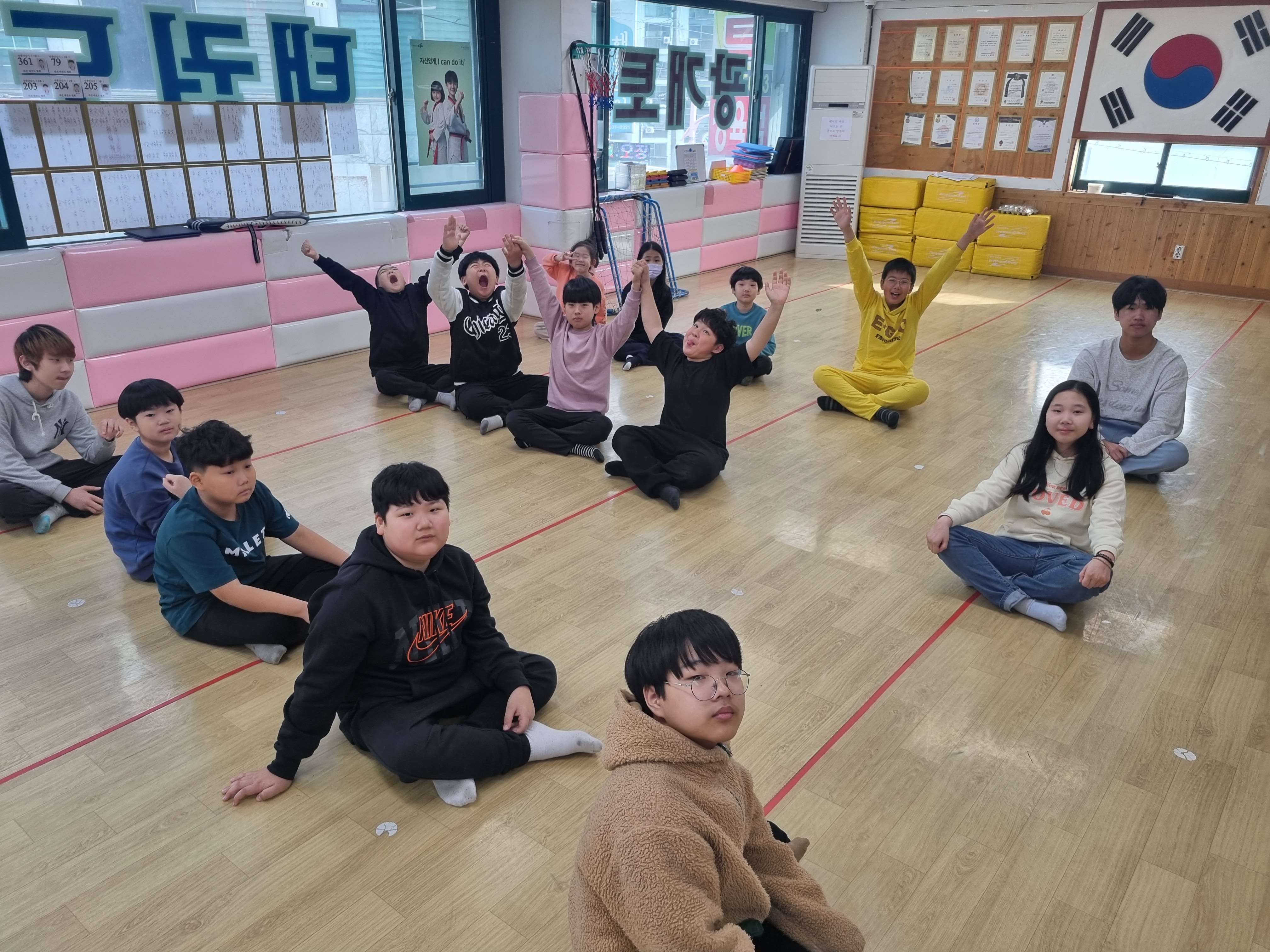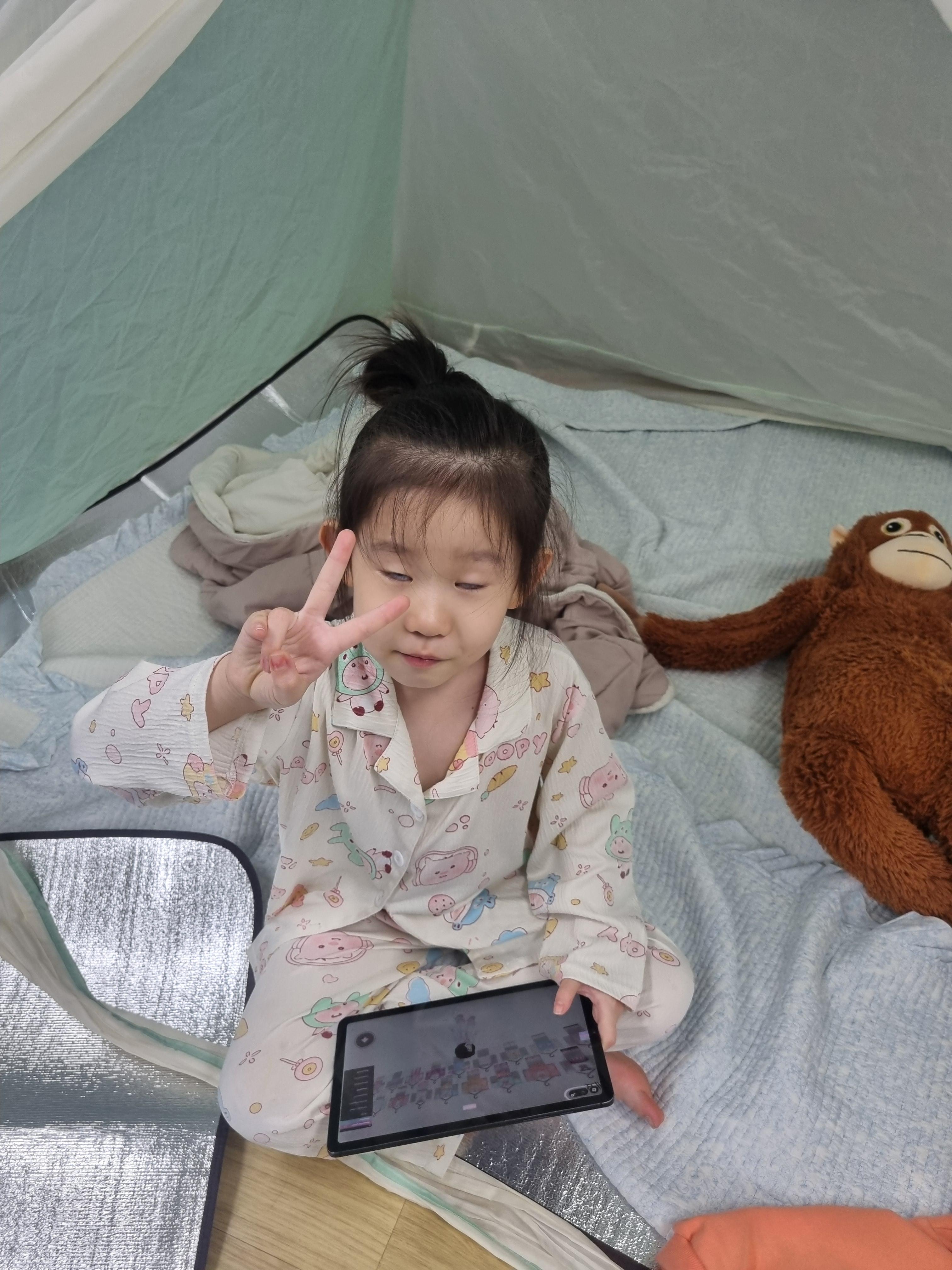 산책후 태권도장에 와서 텐트와 이불정리를 한 후