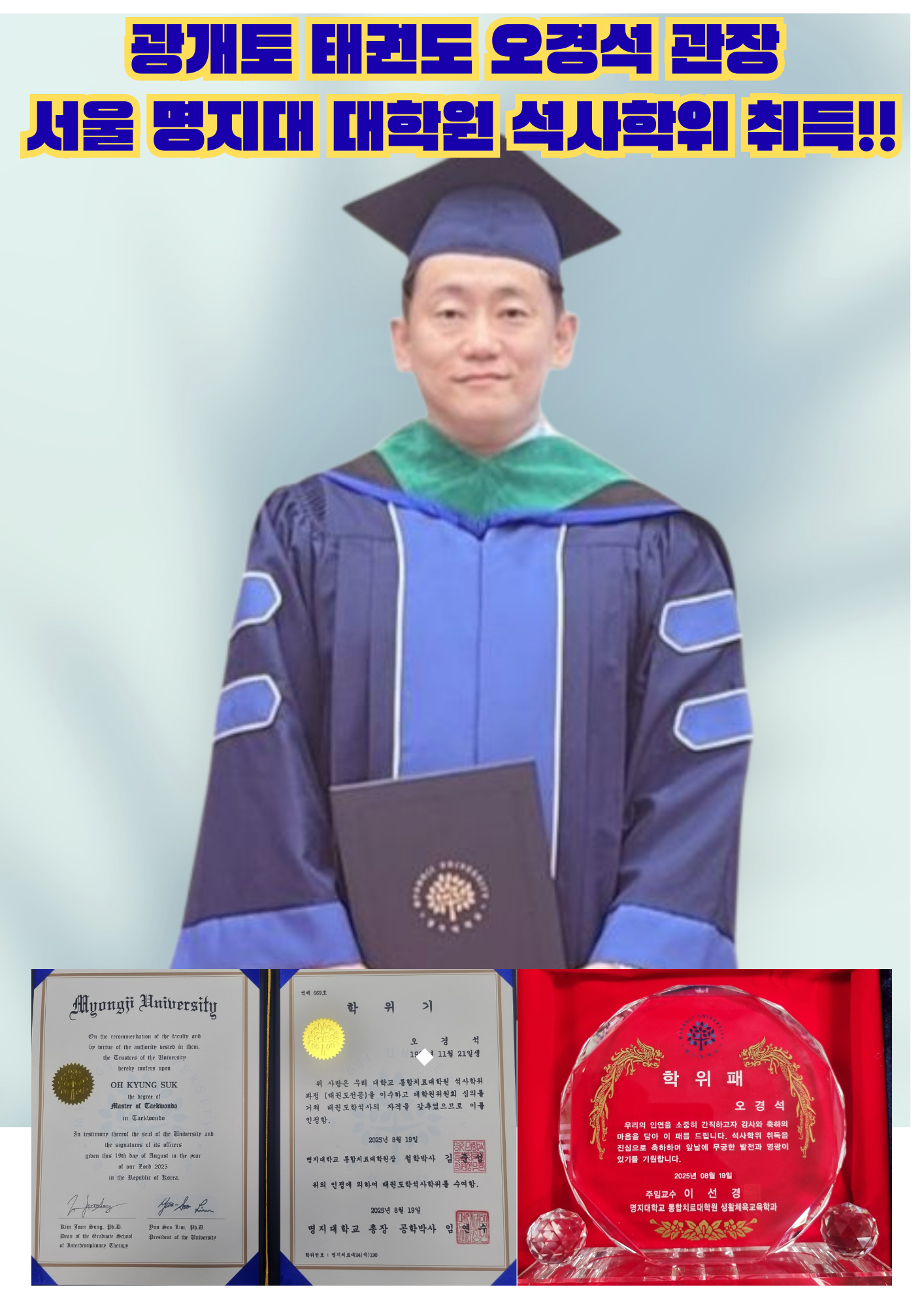 제가 이번에 서울 명지대학교 대학원 태권도학 석사학위를 받게 되었습니다.